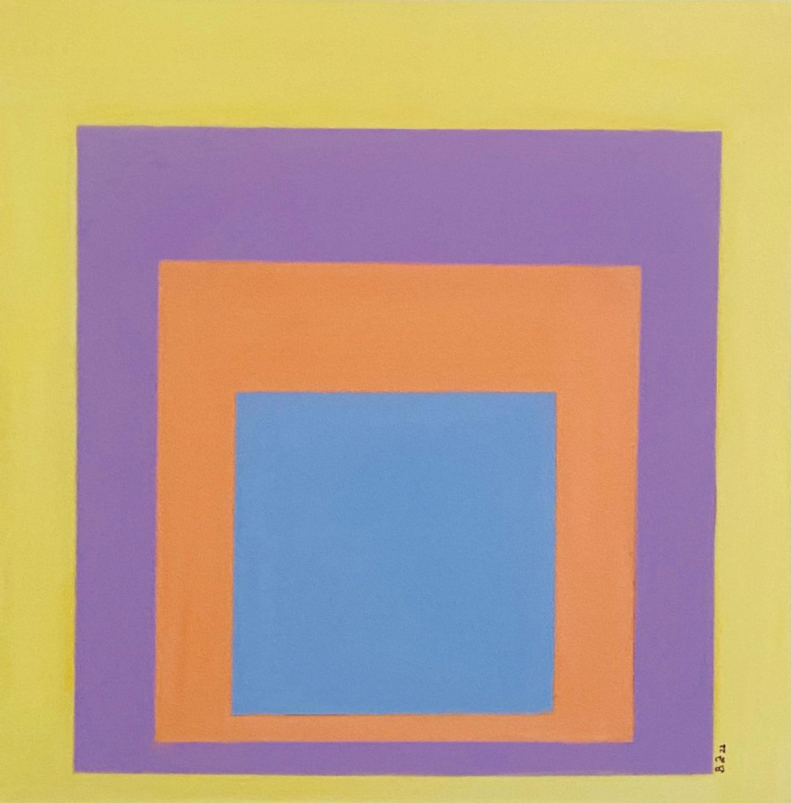 Dans cette œuvre, les couleurs se répondent par couches successives, comme des vibrations qui se propagent vers l’extérieur. L’influence de Josef Albers est perceptible dans la simplicité de la forme et la subtilité des contrastes chromatiques. Mais au-delà de l’hommage, l’intention est de créer un espace de contemplation où chaque carré devient à la fois fenêtre et écho, invitant le regard à plonger dans un rythme silencieux, construit par la pureté des teintes et leur équilibre.