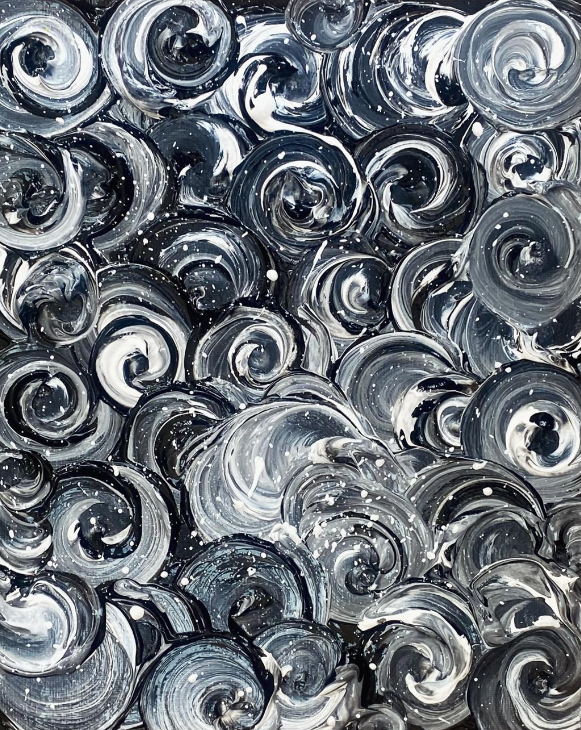 Les spirales en clair-obscur se déploient comme des galaxies intérieures. L’œuvre évoque des murmures célestes, une respiration silencieuse entre ombre et lumière