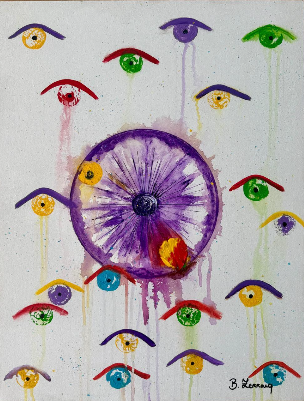 Dans cette toile, les yeux deviennent des astres, autant de visions suspendues dans un ciel intérieur. Autour d’un centre vibrant, chaque regard trace une trajectoire singulière, révélant la diversité des perceptions et des émotions humaines. L’œuvre invite à contempler l’univers infini qui se déploie en nous et autour de nous.