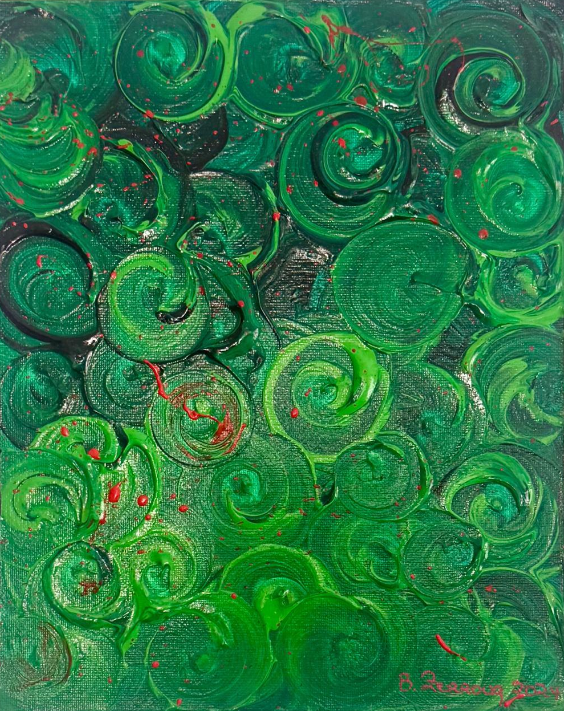 Les nuances vertes, traversées d’éclat rouge, traduisent la force vitale de la nature. Cette œuvre incarne une flamme émeraude, à la fois fragile et intense, symbole d’énergie et de renouveau