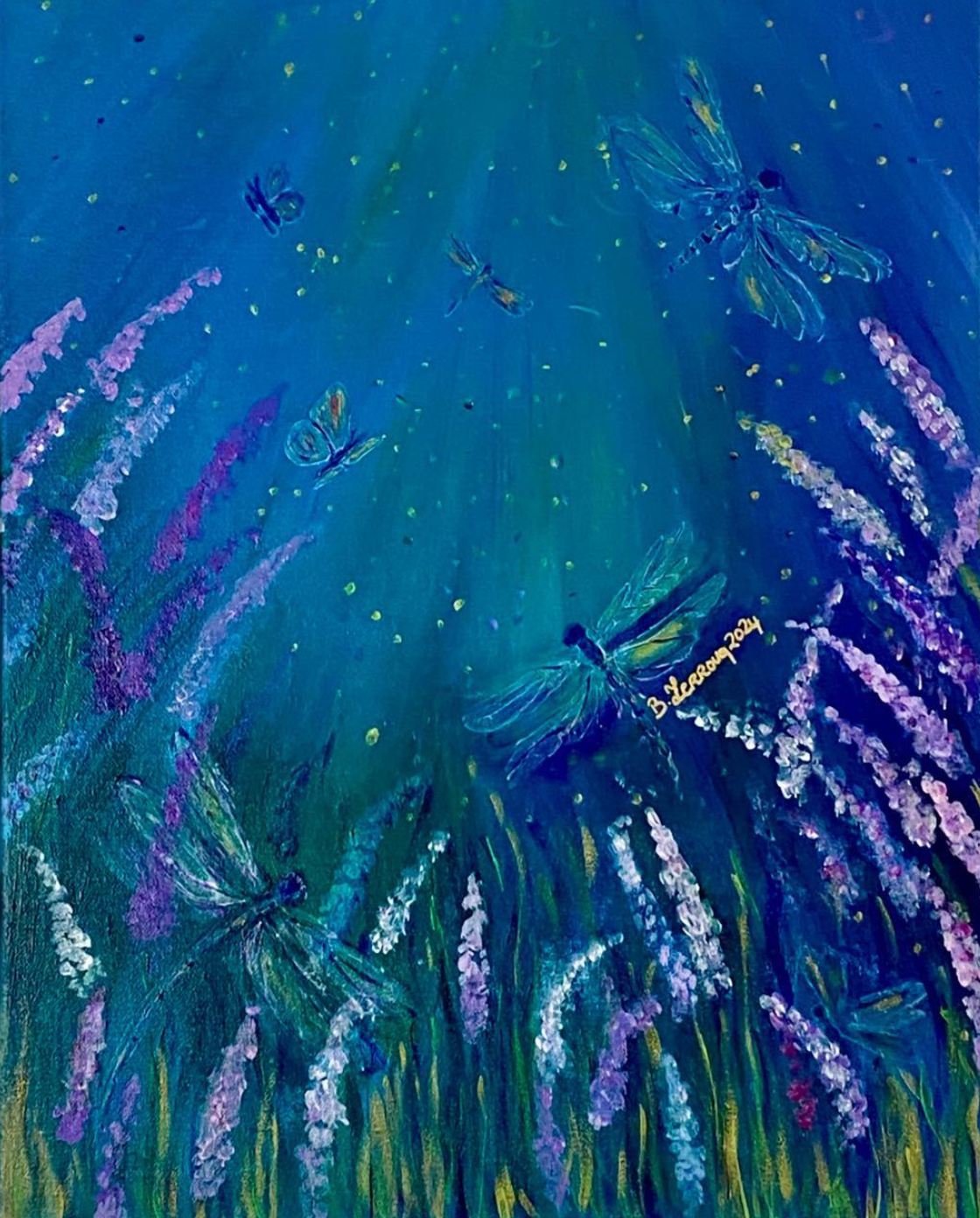 Dans cette série, la nature se déploie sous une forme figurative et poétique : champs de lavande habités de libellules, bougainvilliers éclatants ou encore mer et soleil se rencontrent dans une écriture picturale sensible. Ces œuvres se situent dans un dialogue constant entre abstraction et figuration, où les formes naturelles se transforment en rythmes colorés et en espaces intérieurs.
