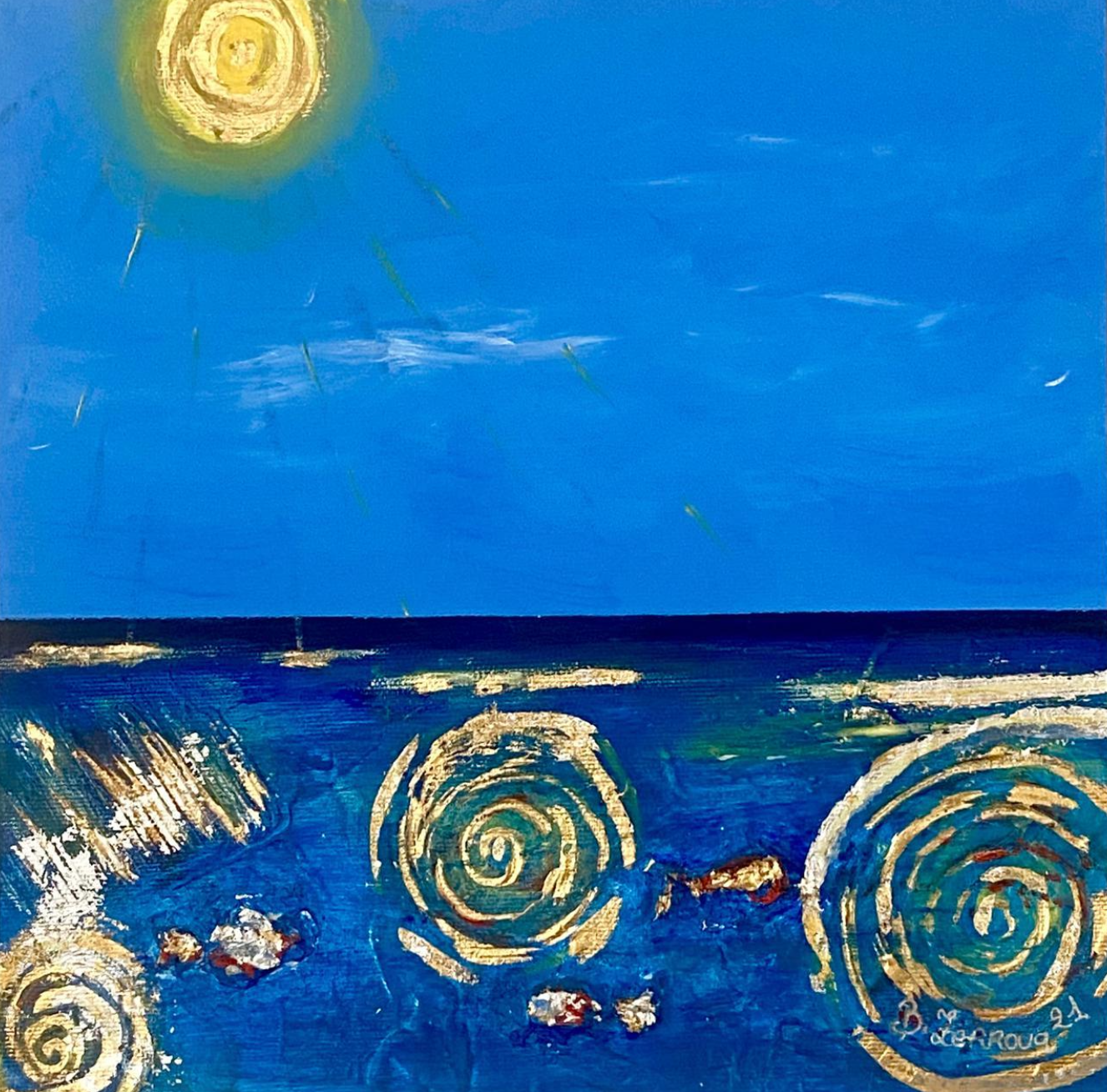 Sous un ciel éclatant, la mer s’anime de spirales dorées qui dansent à la surface de l’eau. Le soleil, souverain, éclaire cet univers vibrant où l’horizon devient un espace de rêve, entre énergie cosmique et poésie marine.