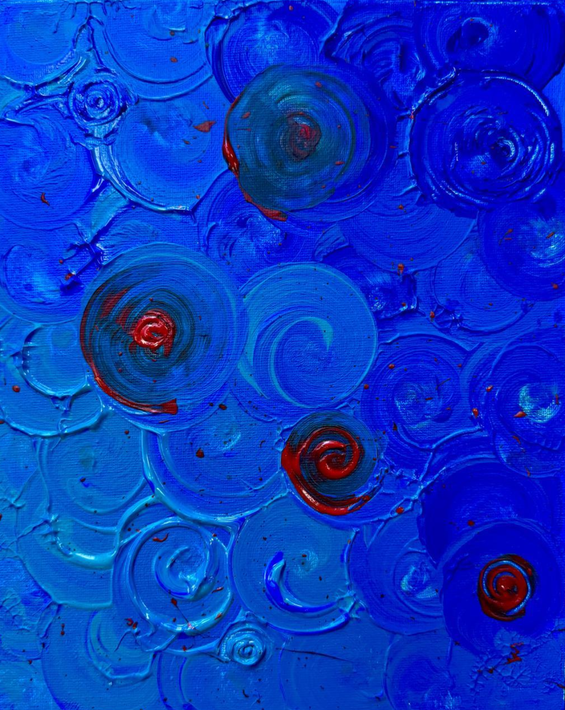 Dans les nuances bleues traversées d’éclats rouges, l’œuvre évoque le flux mystérieux des courants de minuit. Elle invite à plonger dans une profondeur silencieuse, entre force obscure et résonances intimes