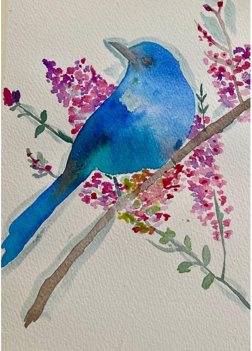 Sur une branche fleurie, l’oiseau bleu devient messager de paix et de liberté. Les couleurs fluides et lumineuses expriment la douceur d’un chant matinal
