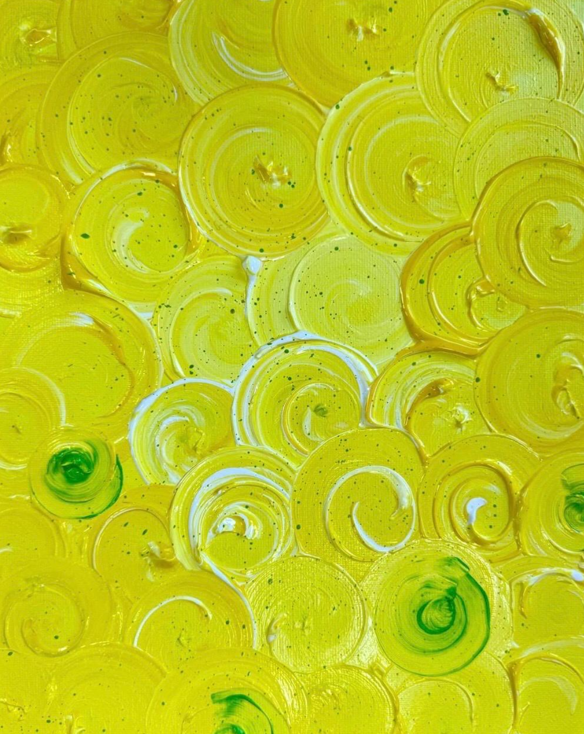 Les spirales jaunes rayonnent comme des éclats de soleil, parcourus de touches vertes et blanches. Cette œuvre incarne une rêverie solaire, lumineuse et vibrante, symbole de chaleur, de joie et d’expansion intérieure