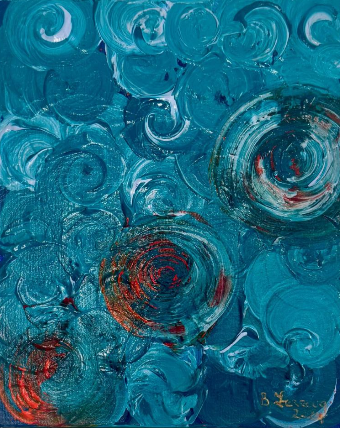 Les spirales bleues et profondes se déploient comme des vagues intérieures, traversées d’éclats rouge corail. Cette œuvre évoque la puissance fluide de la mémoire, entre mouvement océanique et résonances intimes